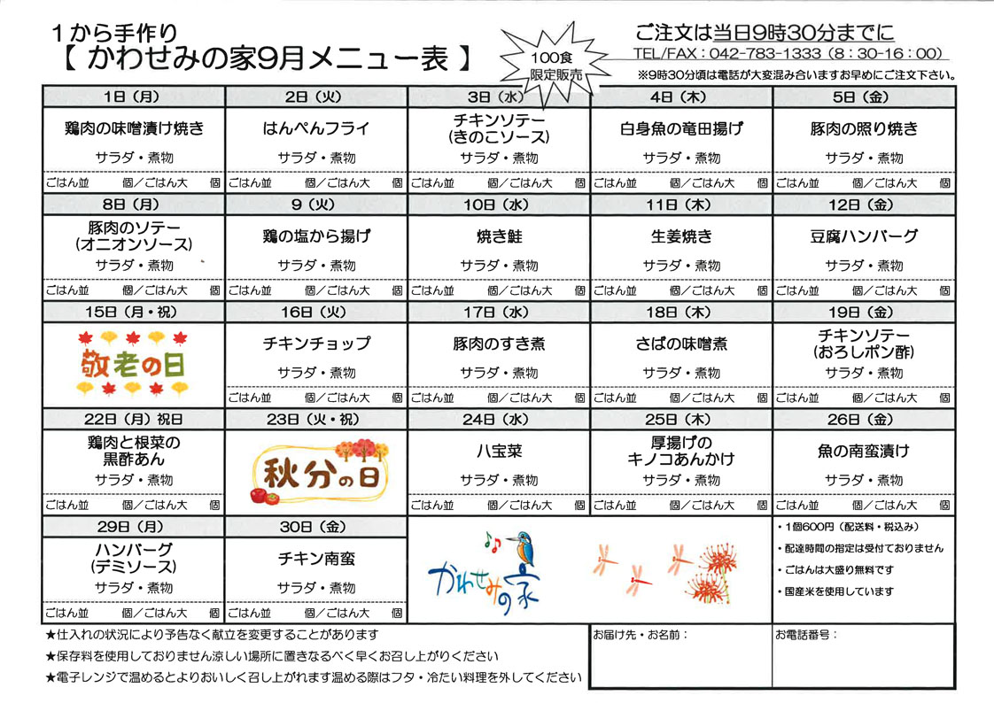 ●配達エリアが限られているため、 新規のお客様は、前日までにお電話ください。 ☎:042-783-1333(FAX同じ)