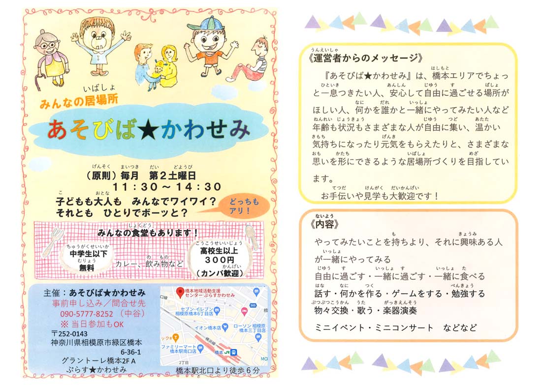 法人が応援している活動「あそびば★かわせみ」は、ぷらす★かわせみにて行われています。 参加をご希望の方は事前に予約をよろしくお願いいたします。 詳細はチラシをご覧ください。 ➡アクセスはこちらをご覧ください