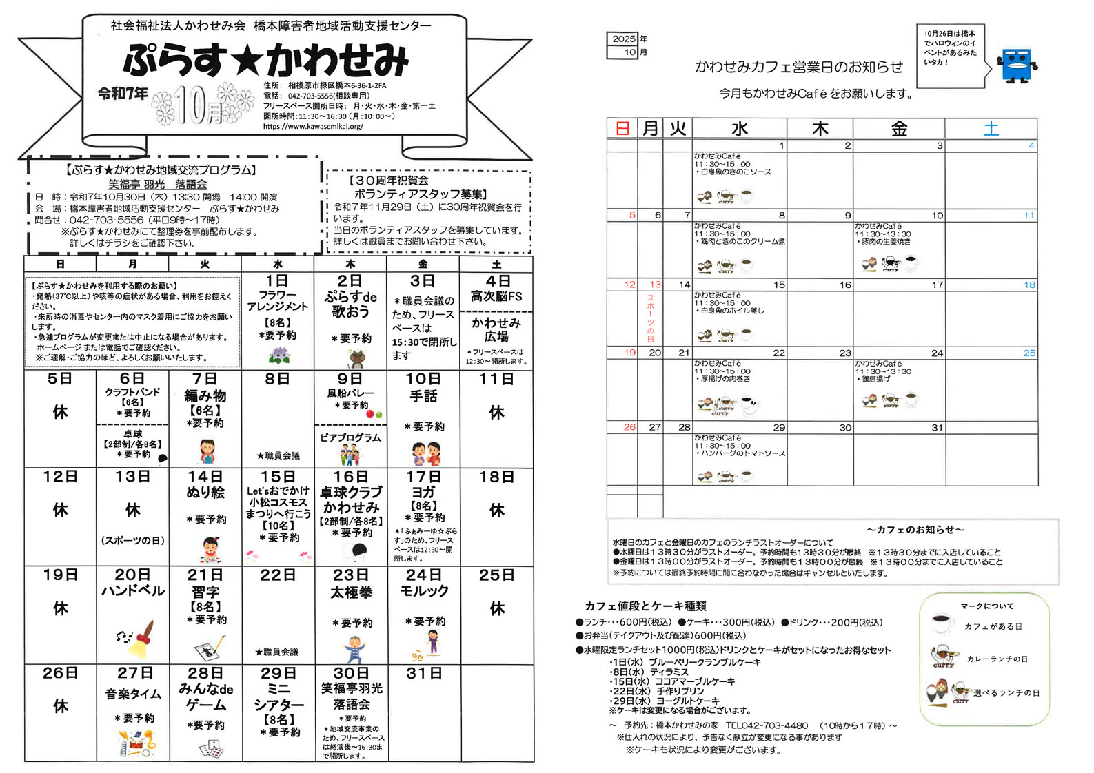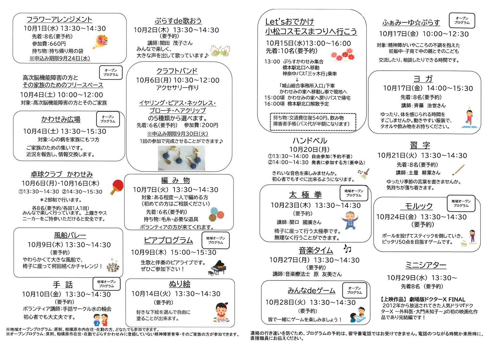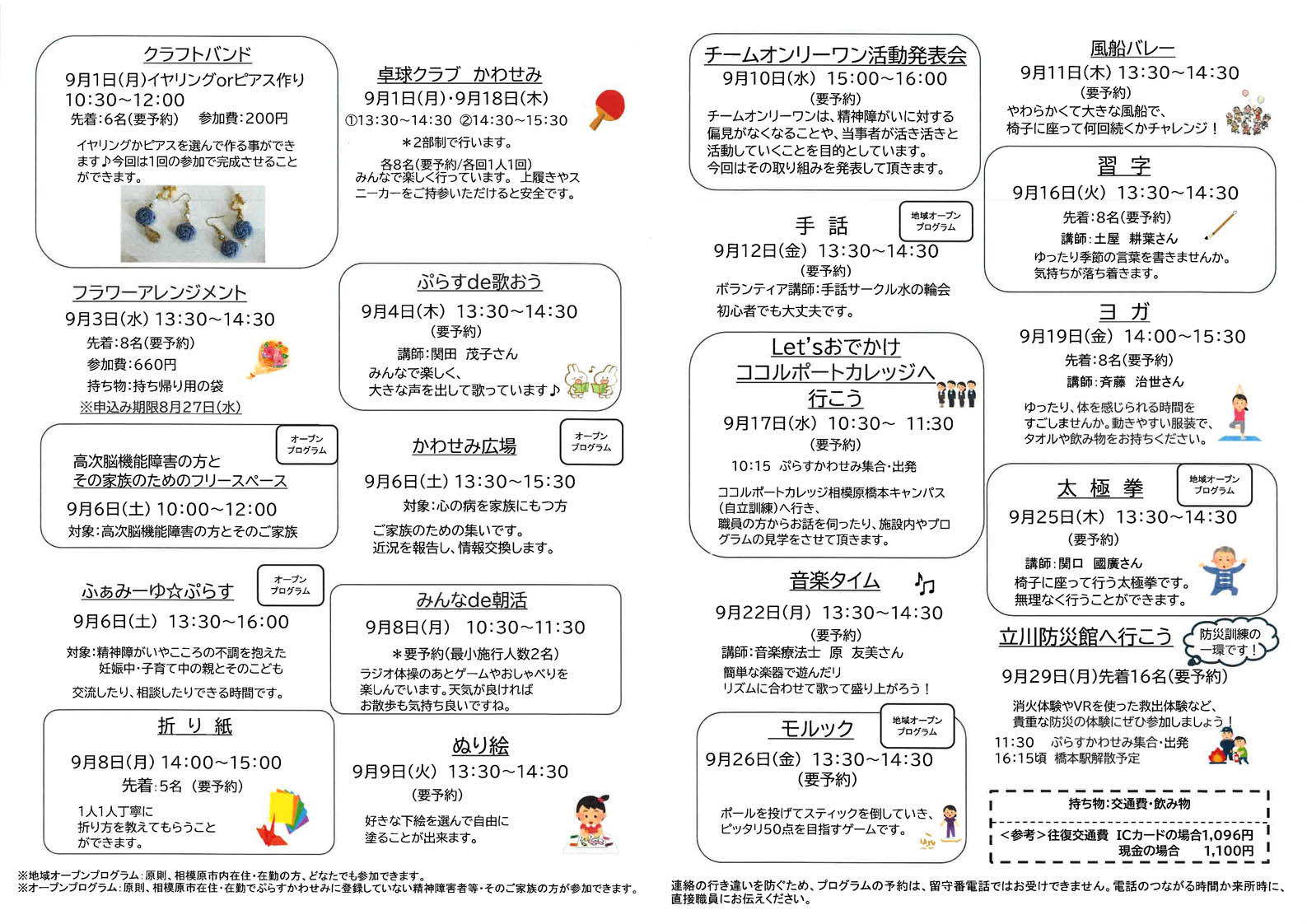 フラワーアレンジメント/ぷらすで歌おう/卓球/習字/手話/小物作り/太極拳/折り紙/ぬり絵/風船バレー/ハンドベル/みんなde朝活/編み物/パソコン個人レッスン/みんなdeゲーム/ヨガ